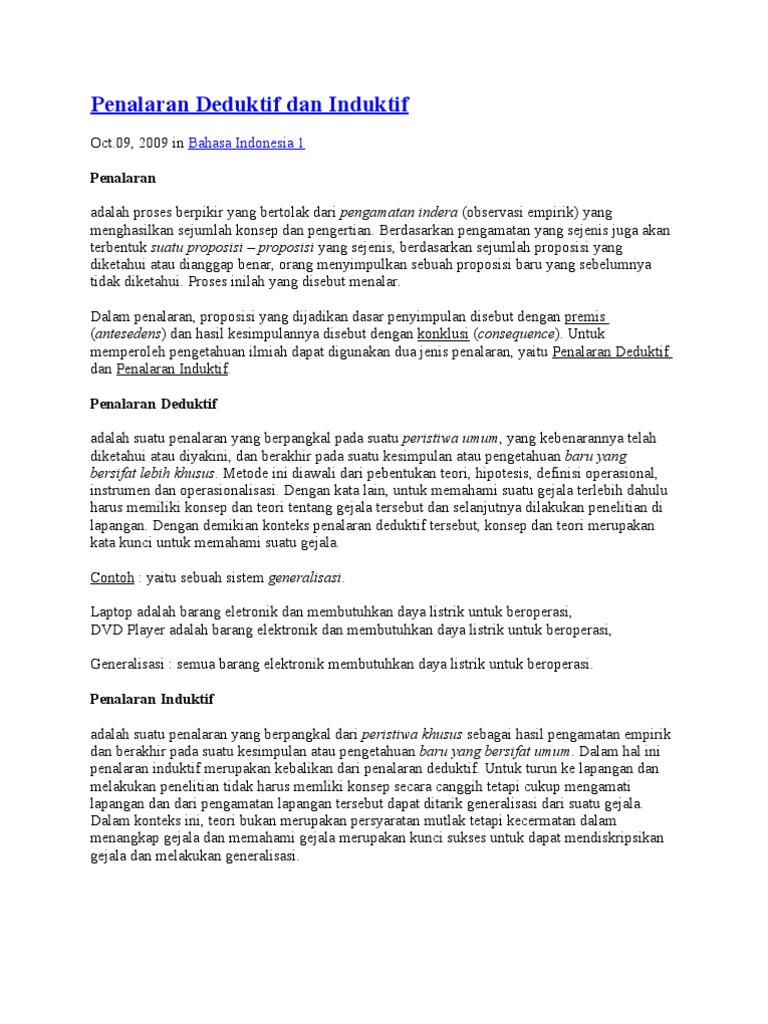 Makalah filsapat ilmu penalaran, logika, deduktif, induktif dan metode ilmiah pendahuluan filsafat adalah suatu cara berpikir yang radial dan menyeluruh. Sedangkan penalaran induktif adalah cara menarik kesimpulan yang bersifat umum dari menurut suriasumantri (dalam shofiah, 2007 :15) penalaran induktif adalah suatu proses berpikir yang. Latar belakang masalah pencarian pengetahuan yang benar harus berlangsung menurut prosedur atau kaedah hukum, yaitu berdasar… Tes tersebut juga disebut tes penalaran abstrak atau tes gaya diagramatik. Penalaran induktif (prosesnya disebut induksi) merupakan proses penalaran untuk menarik ada 2 keuntungan dengan penalaran induktif, yaitu: